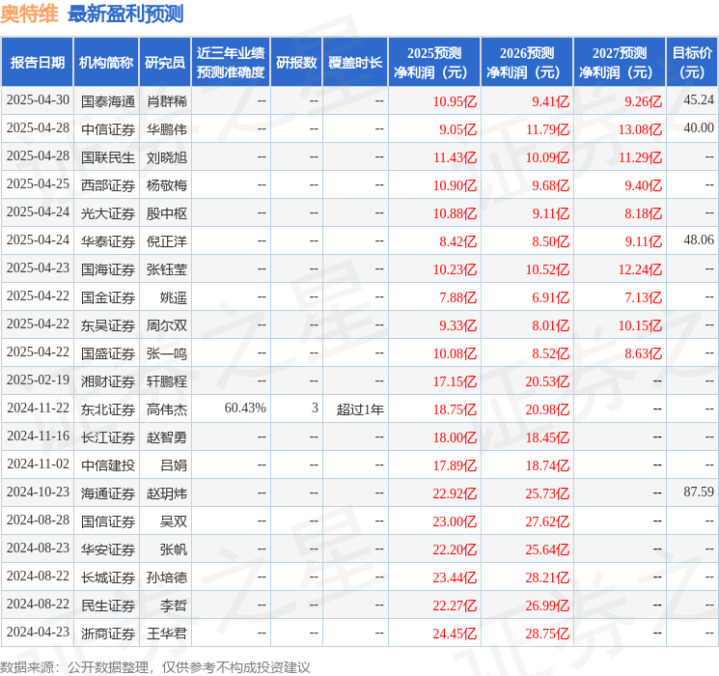 证券之星数据中心根据近三年发布的研报数据计算,东北证券高伟杰研究员团队对该股研究较为深入,近三年预测准确度均值为60.43%,其预测2025年度归属净利润为盈利18.75亿,根据现价换算的预测PE为5.7。